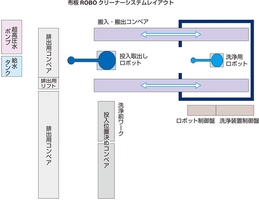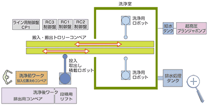 シャトル式コンベアによる超高圧ウォータジェットの狙い撃ち洗浄ができます。